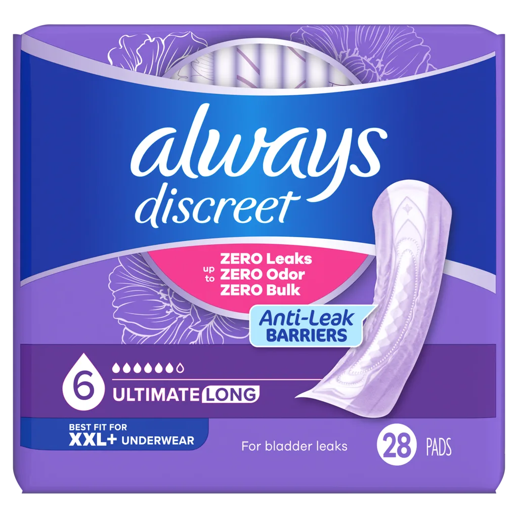 Looking for dependable, strong, bladder leak protection that's barely noticeable under clothes? Experience incredible bladder leak and postpartum incontinence protection in a surprisingly thin and discreet incontinence pad for women. Always Discreet disposable Incontinence Pads for women provide the comfort you need with up to the 100% leak-free protection you deserve. Thanks to a unique absorbent core that keeps your skin dry by absorbing bladder leaks in seconds, you’ll be able to stay comfortable and feel fresh for hours. Walk with poise and confidence knowing the RapidDry core has double-layer protection that absorbs fluid in seconds and holds up to 5x the average leak, giving you extra bladder control protection where you need it most. The LeakGuards help keep wetness away from the sides and stop leaks at the legs where they happen most, while the lightly scented OdorLock technology neutralizes odors instantly and continuously. Don’t let bladder leaks get in the way of your day. Simply find your best fit with the Always Discreet sizing chart to find your absorbency need and then underwear size to get bladder control pads for women with protection you can depend on. Always Discreet Incontinence Pads are available in bulk for added convenience and come in a complete range of absorbencies and lengths.