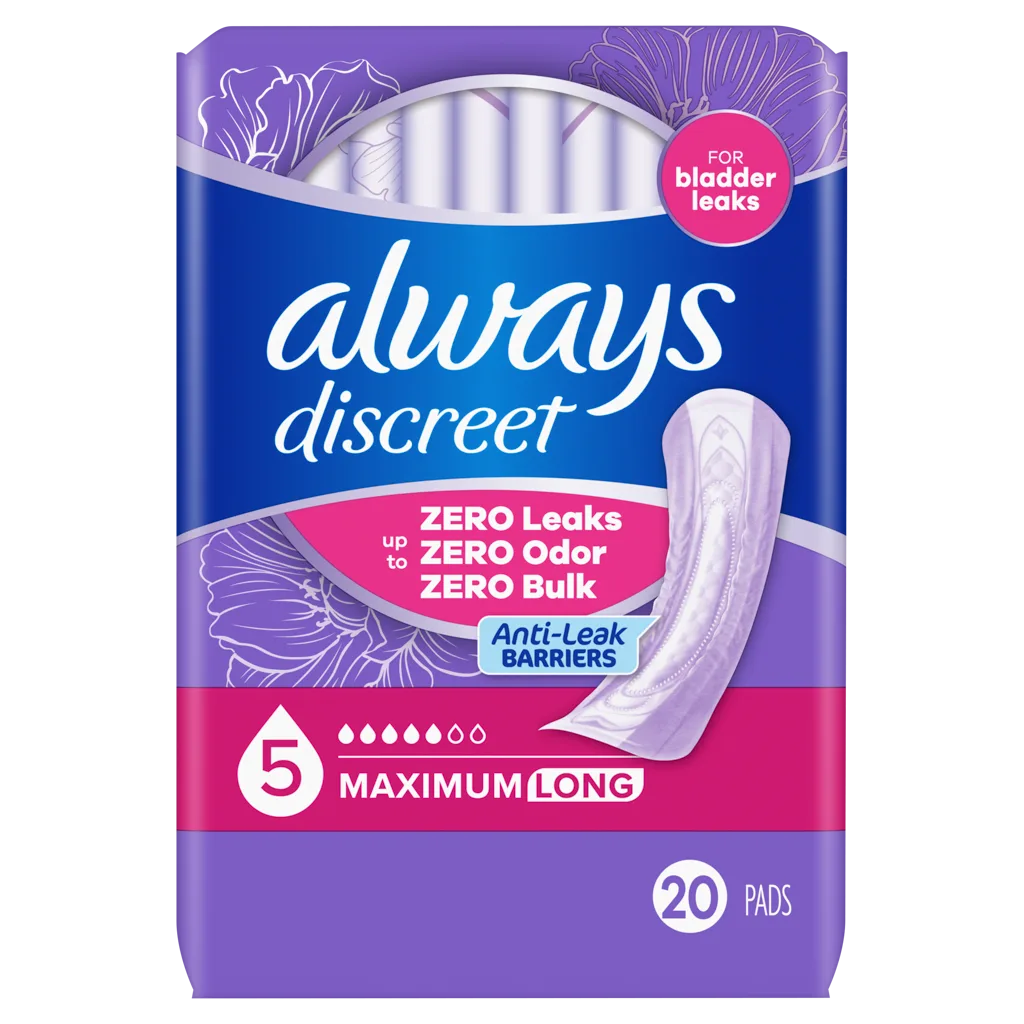 Looking for dependable, strong, bladder leak protection that's barely noticeable under clothes? Experience incredible bladder leak and postpartum incontinence protection in a surprisingly thin and discreet incontinence pad for women. Always Discreet disposable Incontinence Pads for women provide the comfort you need with up to the 100% leak-free protection you deserve. Thanks to a unique absorbent core that keeps your skin dry by absorbing bladder leaks in seconds, you’ll be able to stay comfortable and feel fresh for hours. Walk with poise and confidence knowing the RapidDry core has double-layer protection that absorbs fluid in seconds and holds up to 5x the average leak, giving you extra bladder control protection where you need it most. The LeakGuards help keep wetness away from the sides and stop leaks at the legs where they happen most, while the lightly scented OdorLock technology neutralizes odors instantly and continuously. Don’t let bladder leaks get in the way of your day. Simply find your best fit with the Always Discreet sizing chart to find your absorbency need and then underwear size to get bladder control pads for women with protection you can depend on. Always Discreet Incontinence Pads are available in bulk for added convenience and come in a complete range of absorbencies and lengths.