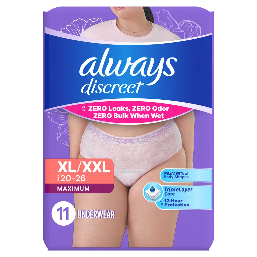 Try Always Discreet incontinence underwear for women. These reimagined adult diapers for women have up to zero leaks, zero odor, and zero bulk when wet for incontinence protection you can depend on. Designed to fit up to 95% of body shapes, these reimagined adult diapers for women range from sizes 2-26W+. Perfect for everyday use and also ideal as postpartum underwear, our products have a cottony soft 4 way stretch that fits like real underwear. These innovative disposable underwear for women feature a super absorbent core that wicks away moisture and turns liquid to gel, ensuring up to 12 hours of maximum absorbency and up to 100% leak-free protection you can depend on. These reimagined adult diapers for women also have LeakGuards that help contain leaks and prevent incontinence overflow and Odorlock technology that continually neutralizes odor. These lightly scented incontinence underwear for women are 40% drier* (*vs. leading brand) for all day freshness and confidence. As an HSA/FSA eligible product, managing your incontinence has never been easier. Embrace life without limits and choose Always Discreet - reimagined adult diapers for women you can depend on! Love it or your money back (*see alwaysdiscreet.com for full details. Refund issued by mail via prepaid card. Terms of prepaid card apply. Original receipt and UPC required within 60 days of purchase. Limit one).