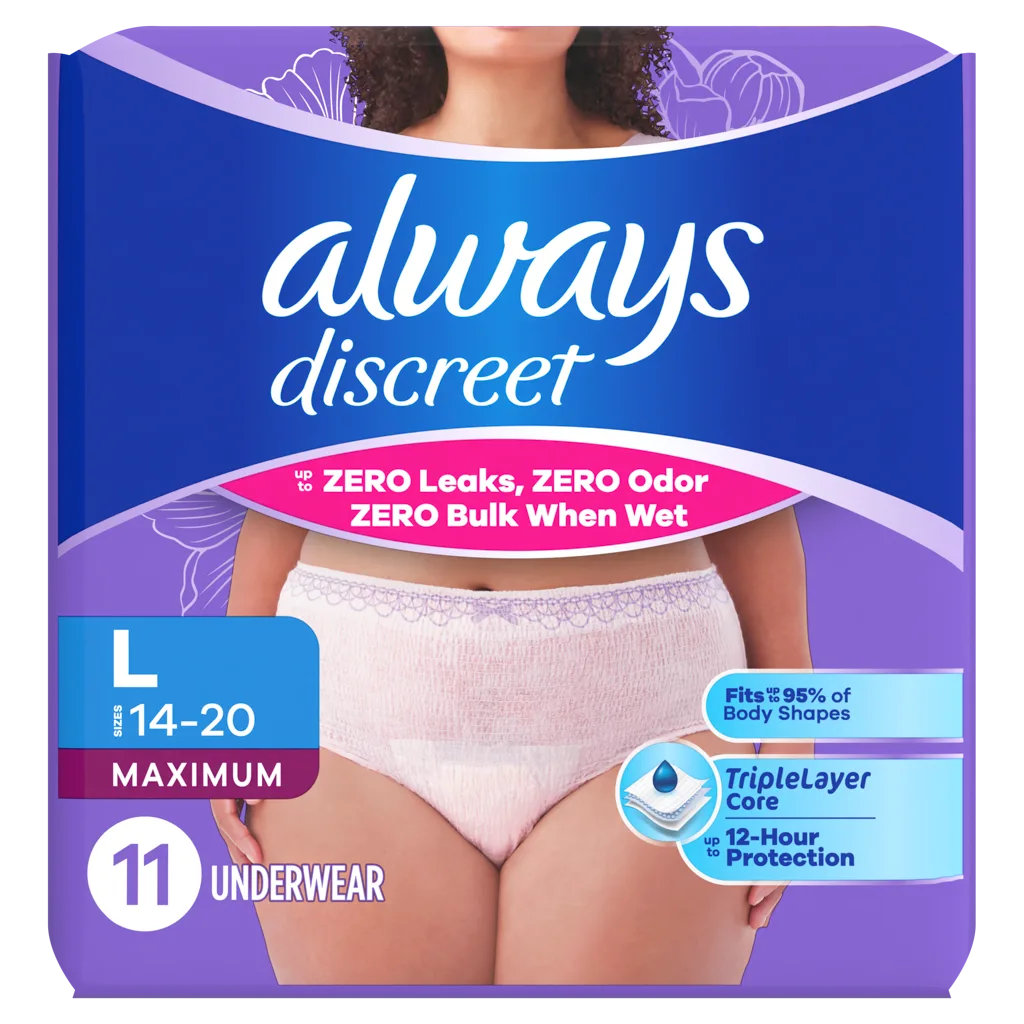 Try Always Discreet incontinence underwear for women. These reimagined adult diapers for women have up to zero leaks, zero odor, and zero bulk when wet for incontinence protection you can depend on. Designed to fit up to 95% of body shapes, these reimagined adult diapers for women range from sizes 2-26W+. Perfect for everyday use and also ideal as postpartum underwear, our products have a cottony soft 4 way stretch that fits like real underwear. These innovative disposable underwear for women feature a super absorbent core that wicks away moisture and turns liquid to gel, ensuring up to 12 hours of maximum absorbency and up to 100% leak-free protection you can depend on. These reimagined adult diapers for women also have LeakGuards that help contain leaks and prevent incontinence overflow and Odorlock technology that continually neutralizes odor. These lightly scented incontinence underwear for women are 40% drier* (*vs. leading brand) for all day freshness and confidence. As an HSA/FSA eligible product, managing your incontinence has never been easier. Embrace life without limits and choose Always Discreet - reimagined adult diapers for women you can depend on! Love it or your money back (*see alwaysdiscreet.com for full details. Refund issued by mail via prepaid card. Terms of prepaid card apply. Original receipt and UPC required within 60 days of purchase. Limit one).