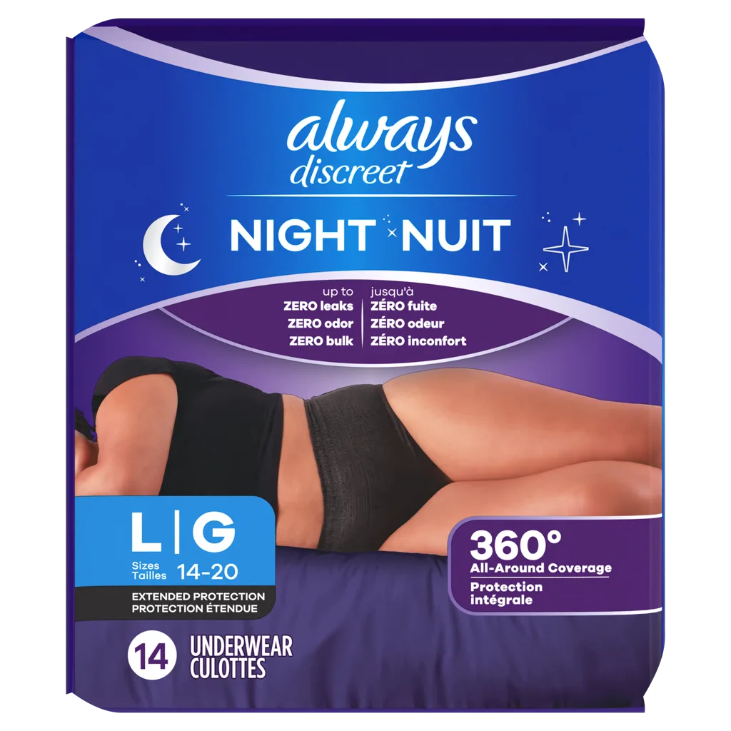 Try Always Discreet Night incontinence underwear for women. These reimagined adult diapers for women have up to zero leaks, zero odor, and zero bulk for incontinence protection you can depend on. Designed to fit up to 95% of body shapes, these overnight adult diapers for women range from sizes 2-26. Perfect for overnight use and also ideal as postpartum underwear, Always Discreet Night underwear for bladder leaks are 25% more absorbent* for while you sleep (* vs. regular Always Discreet). These innovative disposable underwear for women feature a front-to-back unique absorbent core that turns liquid to gel and locks leaks at night. Depend on these for up to 12 hours of extended absorbency and up to 100% leak-free protection. These reimagined adult diapers for women also have curve hugging LeakGuards that help contain leaks and prevent incontinence overflow, and Odorlock technology that instantly and continually neutralizes odor. These lightly scented incontinence underwear for women provide 360 coverage while laying down for up to secure nights and leak free mornings. As an HSA/FSA eligible product, managing your incontinence has never been easier. Embrace life without limits and choose Always Discreet Night - reimagined adult diapers for women you can depend on! Love it or your money back* (*see alwaysdiscreet.com for full details. Refund issued by mail via prepaid card. Terms of prepaid card apply. Original receipt and UPC required within 60 days of purchase. Limit one).