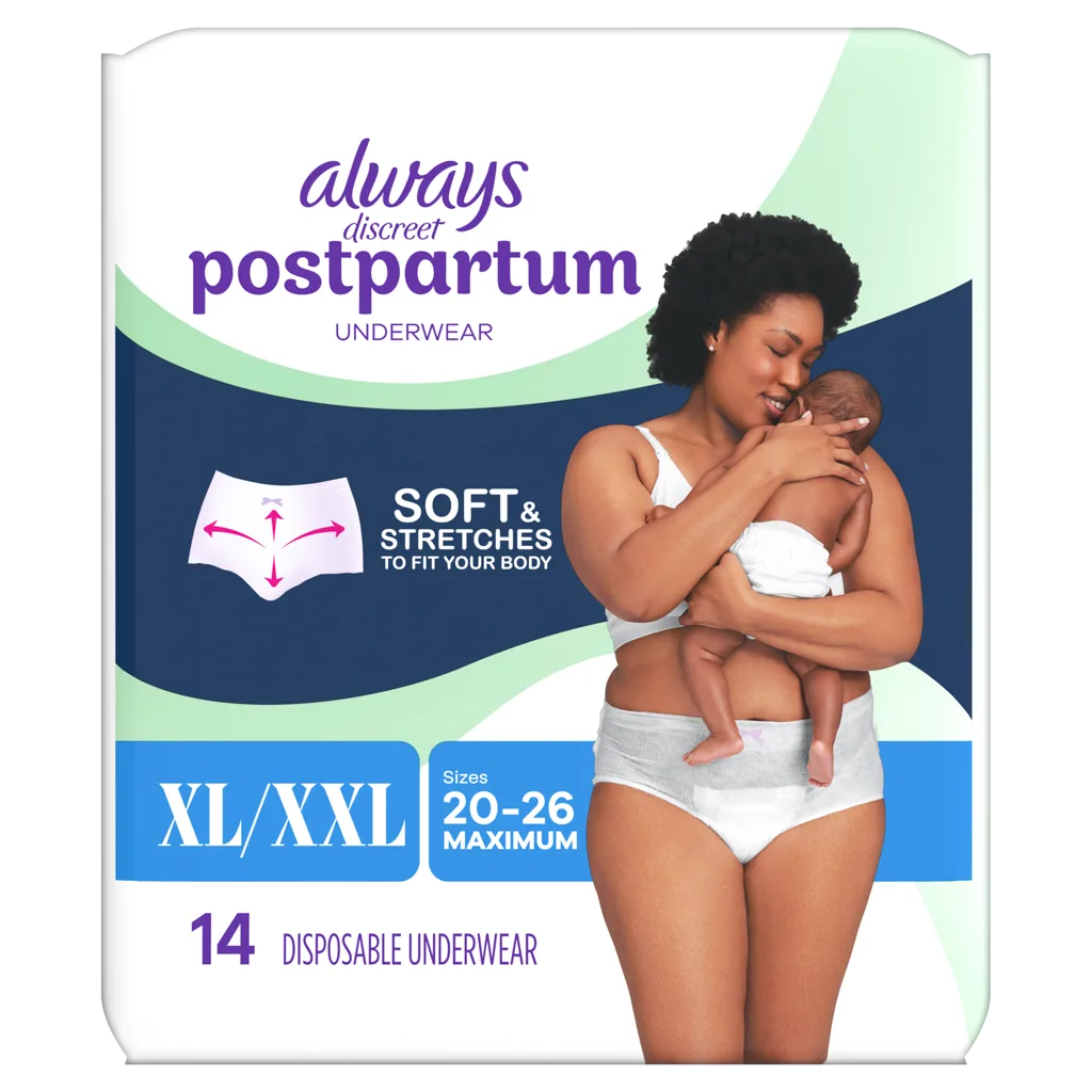 Try Always Discreet Postpartum incontinence underwear for women. These reimagined adult diapers for women have up to 100% leak free postpartum bleeding and bladder leak protection you can depend on. Designed to fit up to 95% of body shapes, these reimagined adult diapers for women range from sizes 2-26. These postpartum underwear are made soft and gentle to fit like real underwear. These innovative disposable underwear for women feature a RapidDry core that turns liquid to gel to help keep you dry, for up to 12 hours of maximum protection you can depend on. These reimagined adult diapers for women also have LeakGuards that help contain leaks and prevent incontinence overflow and Odorlock technology that neutralizes odor. These postpartum underwear for women are designed with sensitive skin in mind, made without fragrances, parabens, and latex* (*from natural rubber). These reimagined adult diapers for women are also hypoallergenic and dematologically tested. As an HSA/FSA eligible product, managing your incontinence has never been easier. Embrace life without limits and choose Always Discreet Postpartum - reimagined adult diapers for women you can depend on! Love it or your money back (*see alwaysdiscreet.com for full details. Refund issued by mail via prepaid card. Terms of prepaid card apply. Original receipt and UPC required within 60 days of purchase. Limit one).